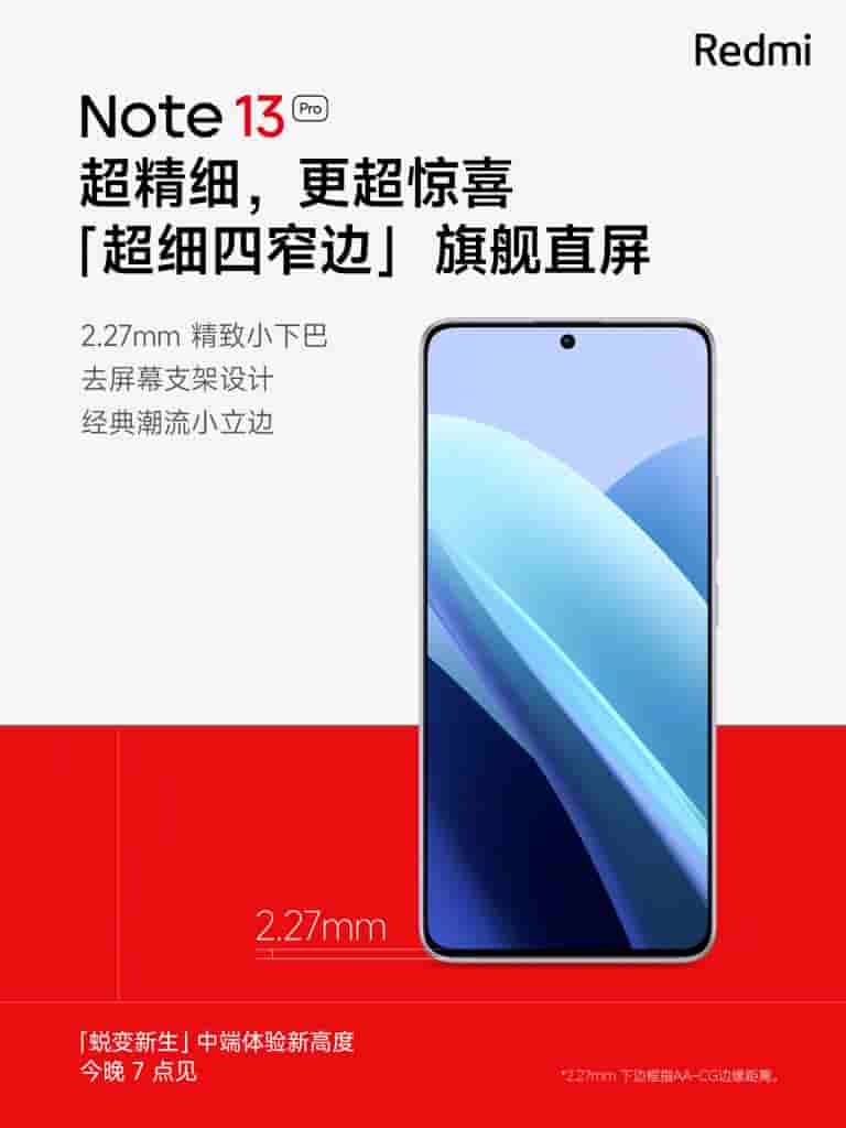 One noteworthy distinction between the two models is that the Redmi Note 13 Pro will sport a flat display, while the Note 13 Pro+ will feature a curved edge screen. Today, Redmi confirmed that the Note 13 Pro will boast an ultra-slim bezel design, with the chin measuring just 2.27mm. The Note 13 Pro will have glass panels on the front and rear, and it will calculate a thickness of 7.98mm.