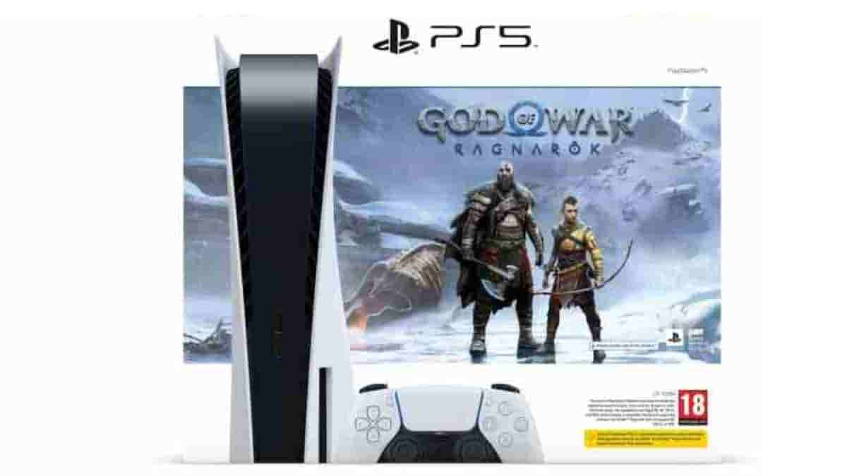 The site shows the PS5 Standard God of War Ragnarök Bundle and the PS5 Standard Standalone console. The PS5 Standard is listed for Rs. 54,990 and the God of War Ragnarök bundle is listed for Rs. 59,390. The bundle features a God of War Ragnarök full game voucher.