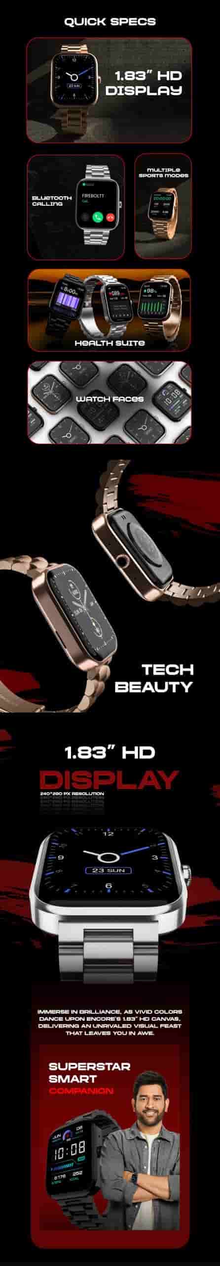 The Fire-Boltt Encore smartwatch features a 1.83-inch HD display with 240 x 280 pixels resolution which will produce vivid colours. The speaker and mic built into this smartwatch makes Bluetooth calling possible from this smartwatch. The Bluetooth calling feature on this smartwatch will keep your smartphone right in your pocket.