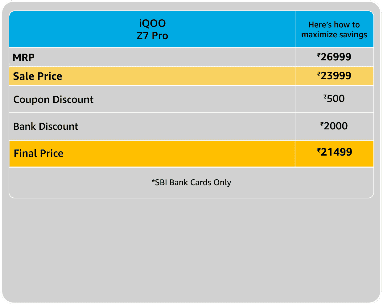 The iQOO Z7 Pro 5G smartphone from its actual list price of Rs. 26,999, will be made available on the shopping platform for a sale price of Rs. 23,999. Along with the coupon discount of Rs. 500 and the bank discount(SBI card only) of Rs. 2,000, the device will be available for purchase at an effective price of Rs.21,499.