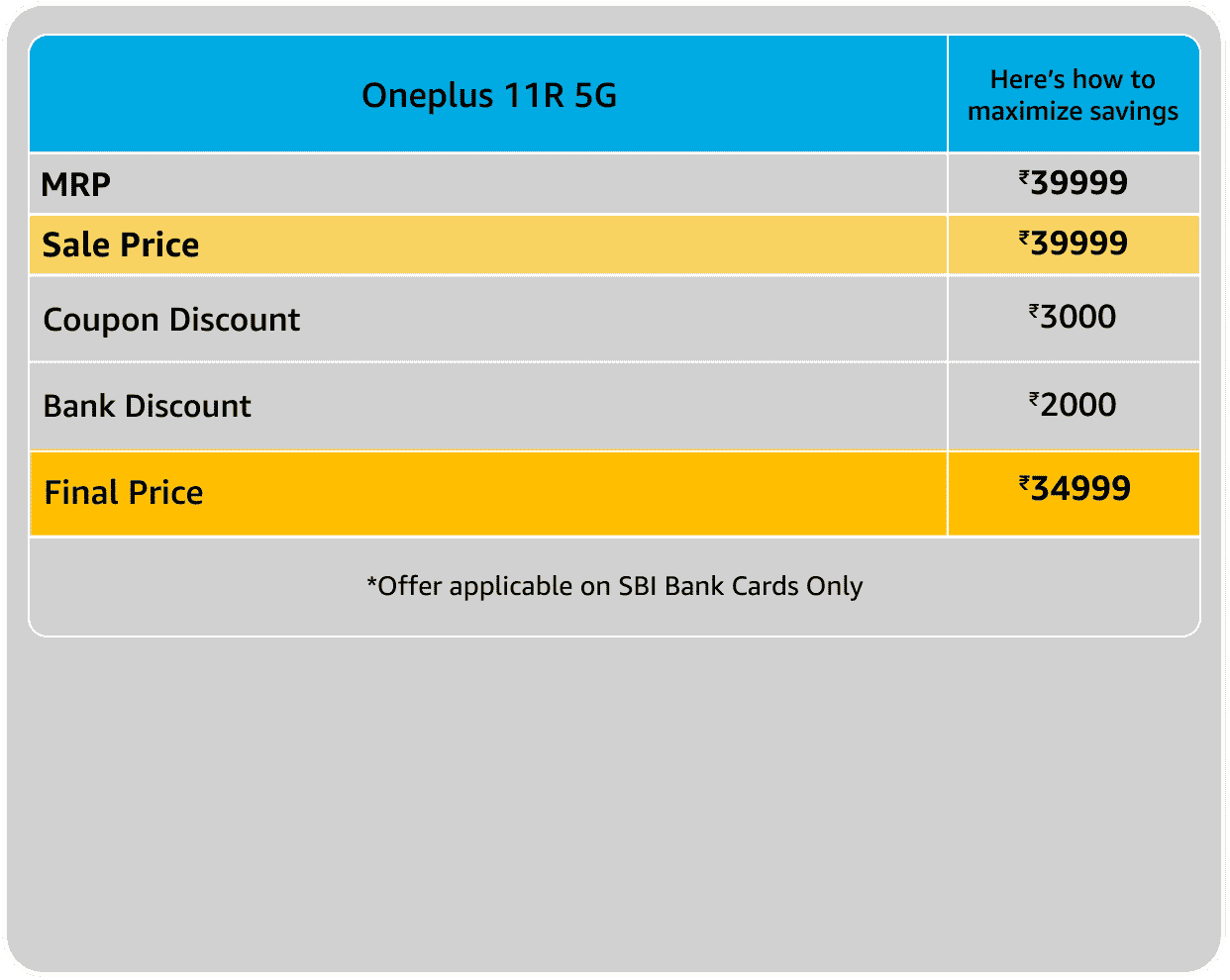 This year’s OnePlus flagship, the OnePlus 11R 5G smartphone, will be listed on the Amazon shopping platform at Rs. 39,999 during the Great Indian Festival sale, with a coupon discount of Rs. 3,000 and the bank discount(which can be availed via SBI card transactions) of Rs. 2,000, customers can get OnePlus’ 11R 5G smartphone device at an effective price point of Rs. 34,999 this offer season.