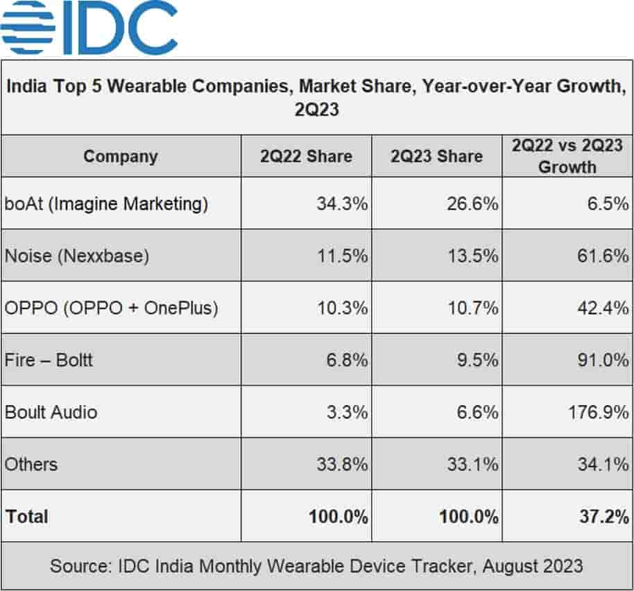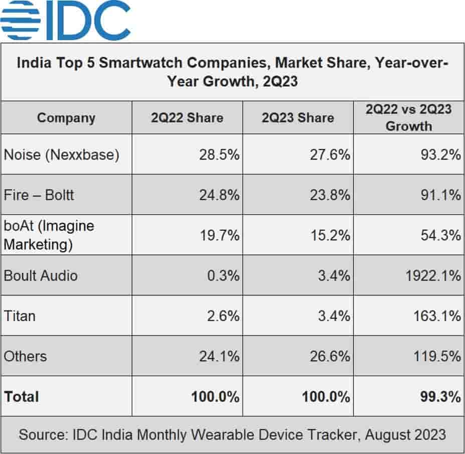 Noise, another Indian brand, holds the second position in overall wearables. It has seen a growth of 61.6% YoY with 13.5% market share. Noise regained its first position in smartwatches with a 27.6% share, growing by 93.2% YoY. It has also moved ahead in the TWS segment with a 6.6% share, growing by 26.3% YoY.