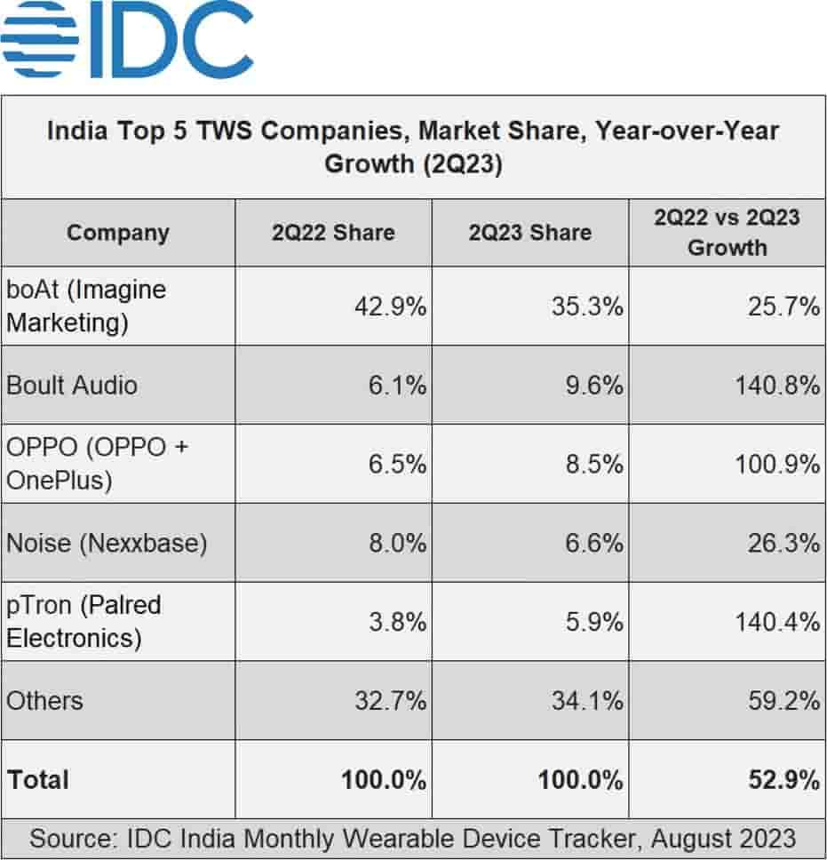 Indian company boAt holds the first position with a 26.6% market share, growing by 6.5% YoY. Earwear has been its core identity that accounts for 77.7% of its shipment in 2Q23 and in the TWS segment, it leads with 35.3% share.