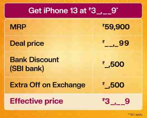 Apple’s 2021 iPhone device, the vanilla iPhone 13 smartphone, from its actual list price of Rs. 59,900 will be available for purchase on the shopping platform at a price that is below Rs. 40,000(Including all bank and exchange offers). Along with the deal price, an SBI bank offer and an additional exchange benefit will also be provided, bringing the effective price to this amazing offer price.